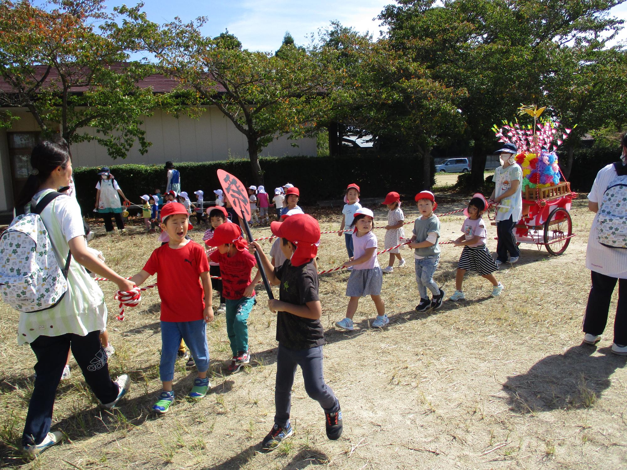 お神輿に、葉っぱのペイントや秋の食べ物を乗せました!一緒に引っ張れるかな?